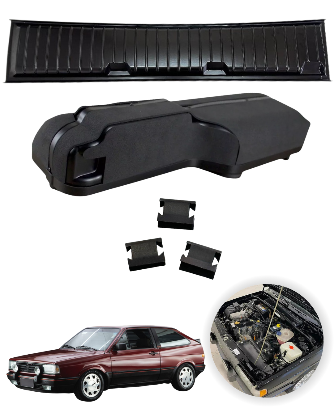 Kit composto por caixa de recírculo do ar e calha de cobertura desenvolvido para reposição e restauração do sistema de ventilação e acabamento do Gol Quadrado. O conjunto garante direcionamento correto do ar, proteção contra entrada de água e sujeira, além de manter o alinhamento e o acabamento original do compartimento.
