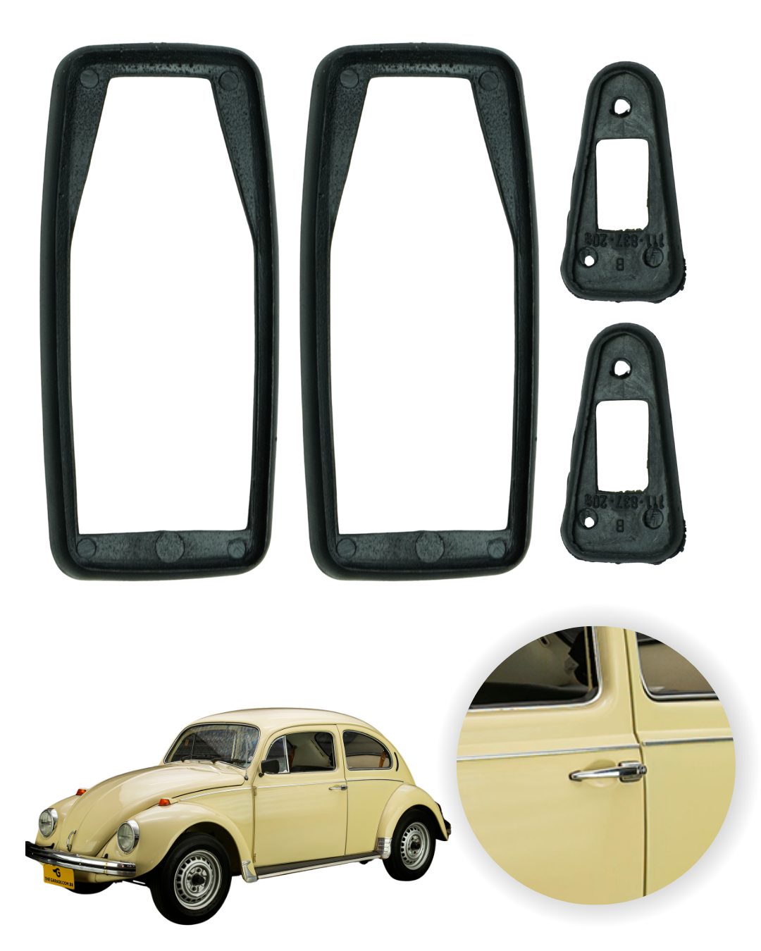 Kit de calços para maçaneta da porta desenvolvido para vedação e acabamento entre a maçaneta externa e a lataria do veículo. Indicado para o Fusca, auxilia na proteção contra entrada de água, poeira e sujeira, além de melhorar o acabamento visual da maçaneta e preservar a pintura da carroceria.