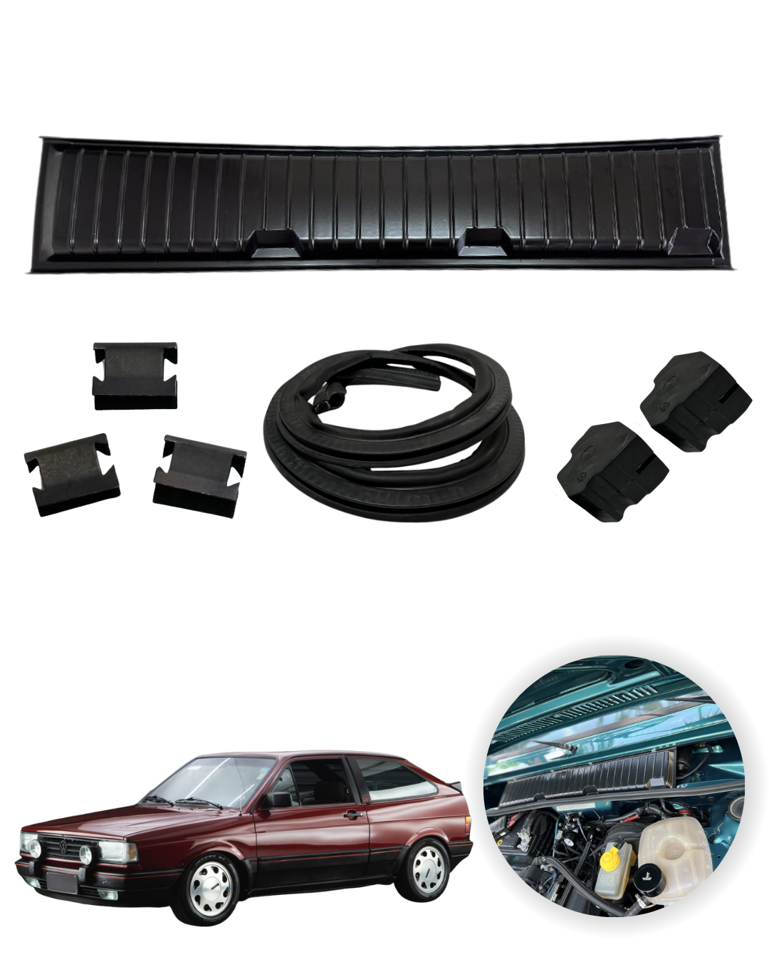 Conjunto de churrasqueira com guarnição, presilhas e calços desenvolvido para reposição e restauração do acabamento frontal do Gol Quadrado. O kit garante fixação correta, melhor vedação e alinhamento adequado da churrasqueira no capô, mantendo a estética e a funcionalidade do veículo.
