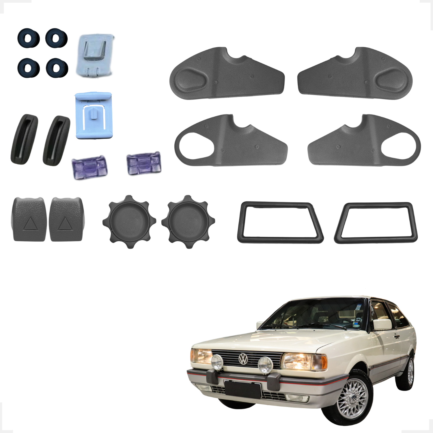 Kit completo de acabamento do banco para VW Gol Quadrado, com 22 peças na cor cinza. Produzido em plástico ABS de alta resistência, oferece excelente durabilidade, encaixe preciso e acabamento uniforme, restaurando o visual original do interior do veículo.