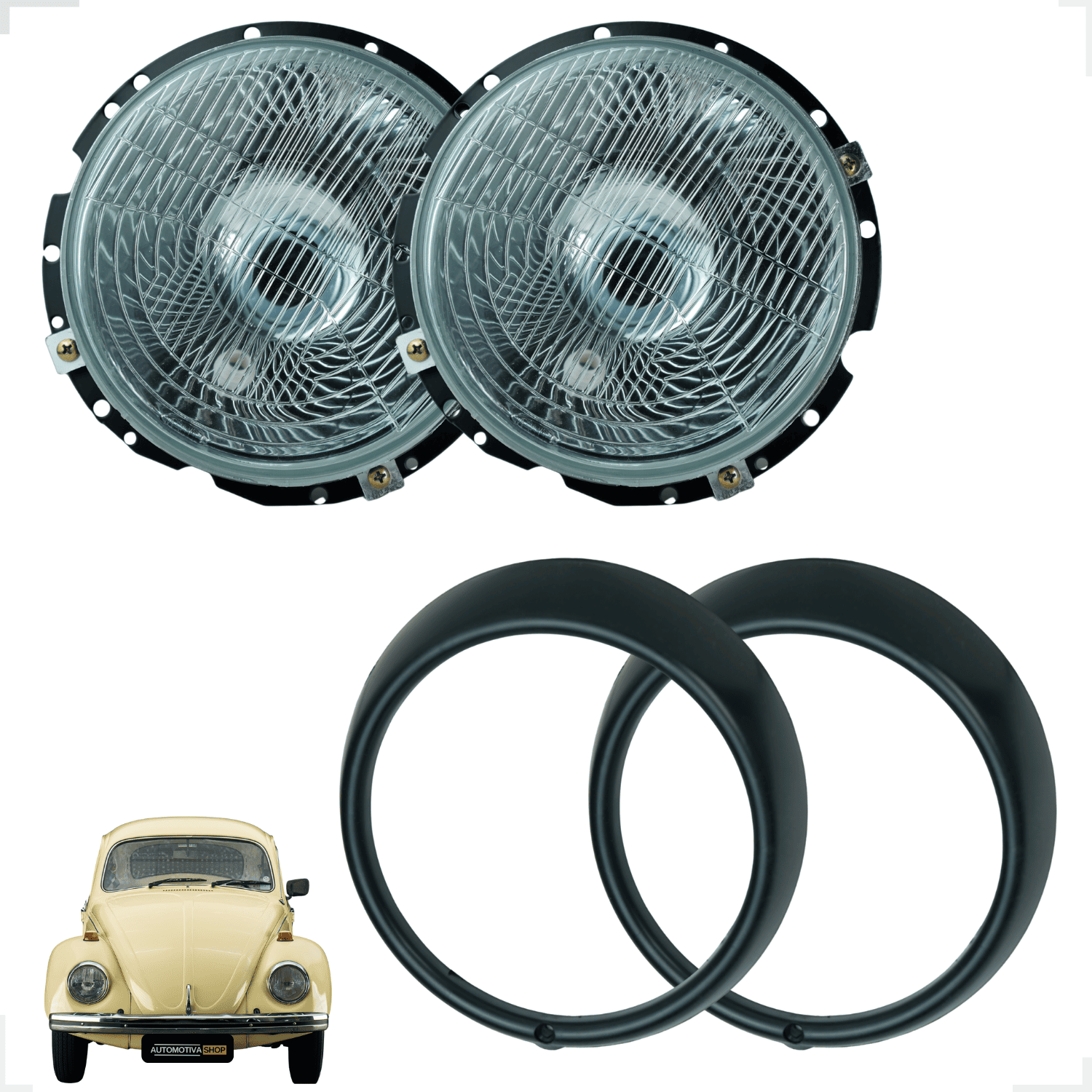 Par de faróis dianteiros com aro na cor preta, desenvolvidos para o VW Fusca (1959 a 1992). Fabricados com lente em vidro e corpo em plástico resistente, proporcionam excelente iluminação e acabamento, preservando o estilo clássico do veículo. Produto ideal para reposição, com encaixe preciso e durabilidade.