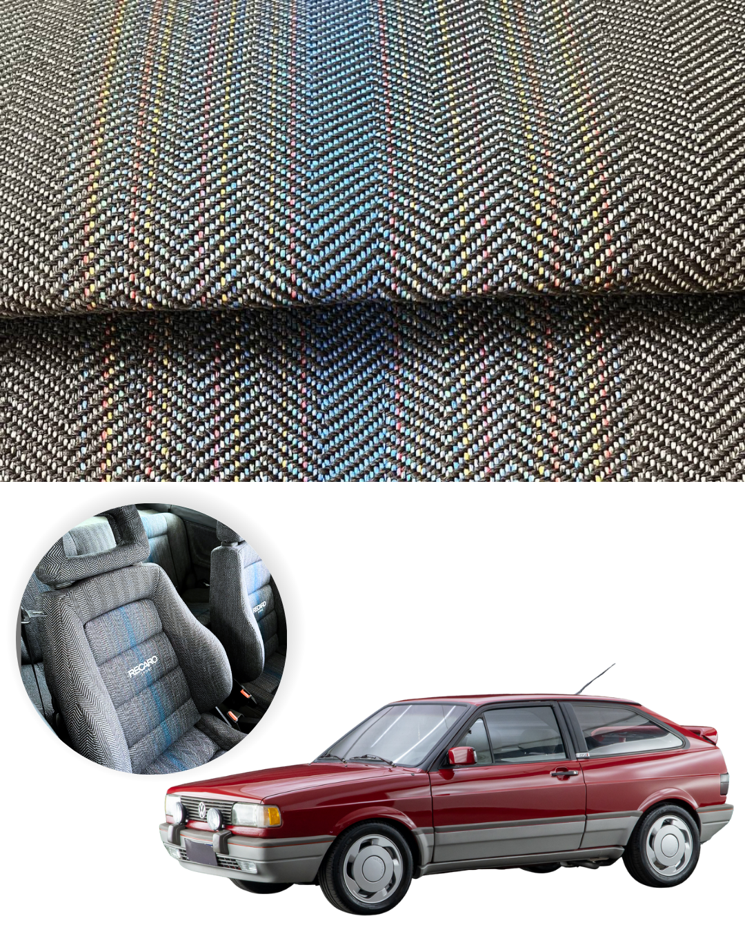 Tecido automotivo padrão Recaro indicado para revestimento de bancos, laterais de portas e acabamentos internos. Ideal para projetos de restauração, personalização ou renovação do interior do veículo, proporcionando visual esportivo e acabamento refinado.